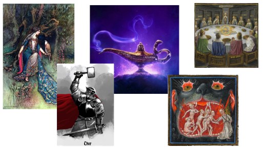 An introduction to medieval literature including Chaucer’s Canterbury Tales, Dante’s Inferno, Malory’s Le Morte D’Arthur, Norse stories of Thor and Loki, and The Arabian Nights.
